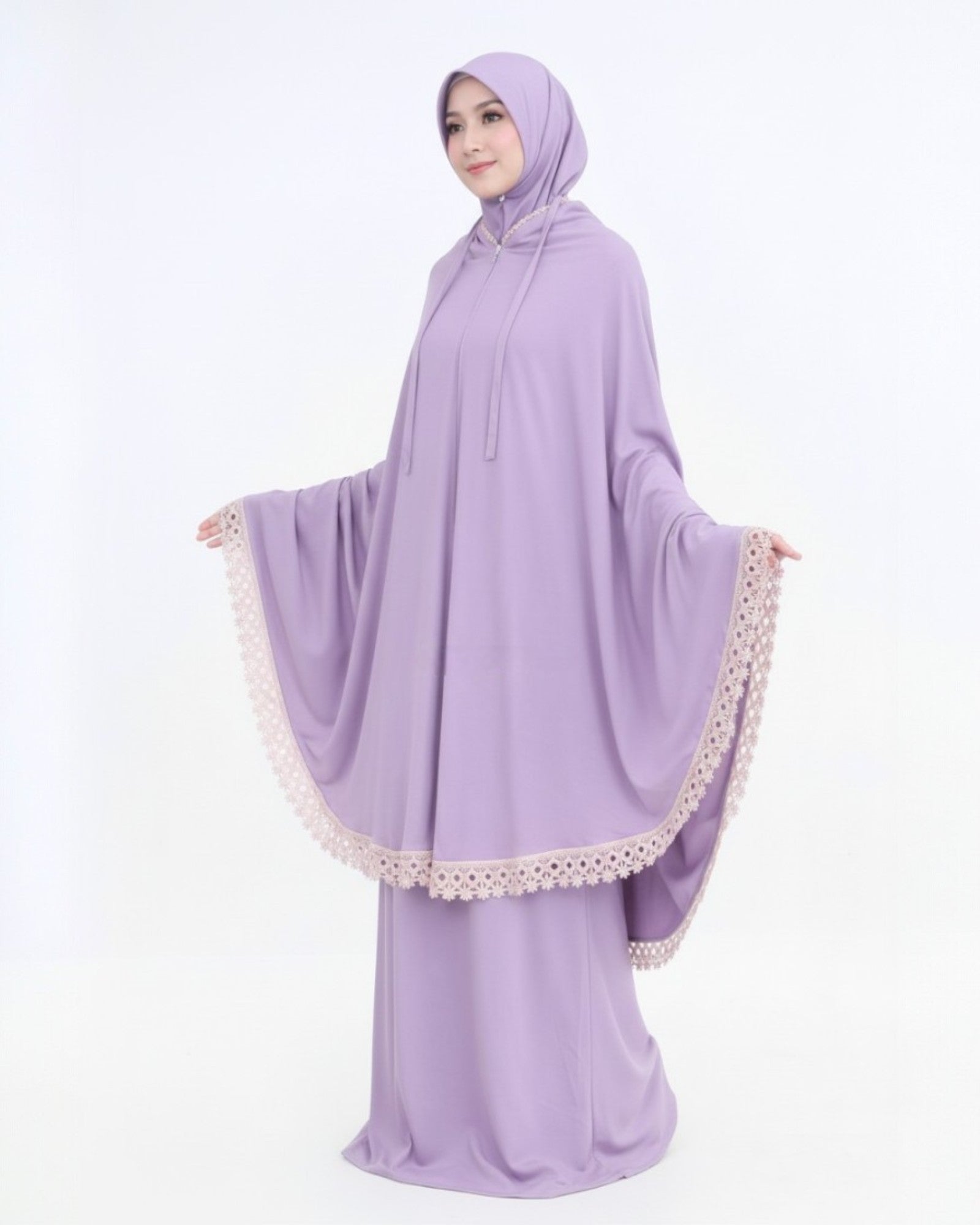 Voorzien van een rits onder de kin – hierdoor kan de mukena op twee manieren gedragen worden: